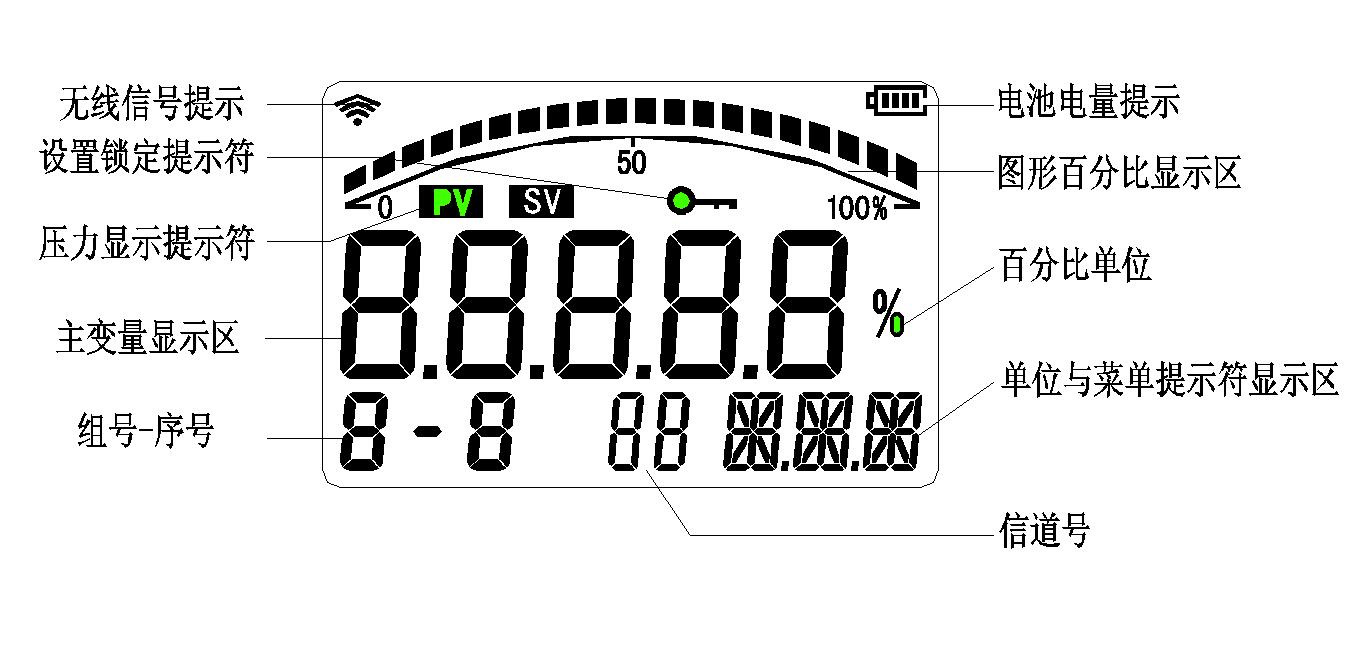 ●.豐富的液晶顯示界面,顯示分辨率可調整,具有電量提示,動態百分比顯示,溫壓顯示切換,通信網絡信號狀態顯示,變送器組號,序號顯示。