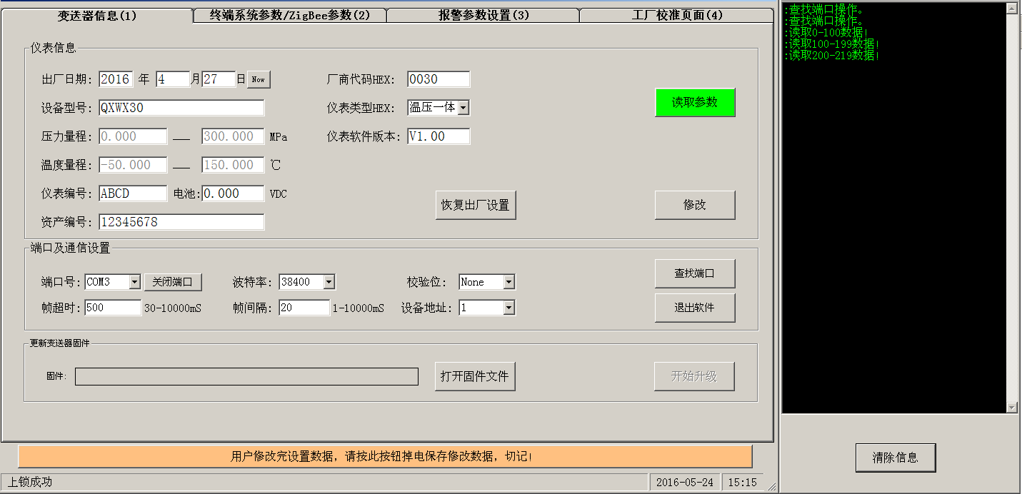 此頁面主要顯示變送器的出廠日期,設備型號,廠家代碼,資產編號,溫度或者壓力的測量范圍,還有本軟件需要使用的端口設置信息。