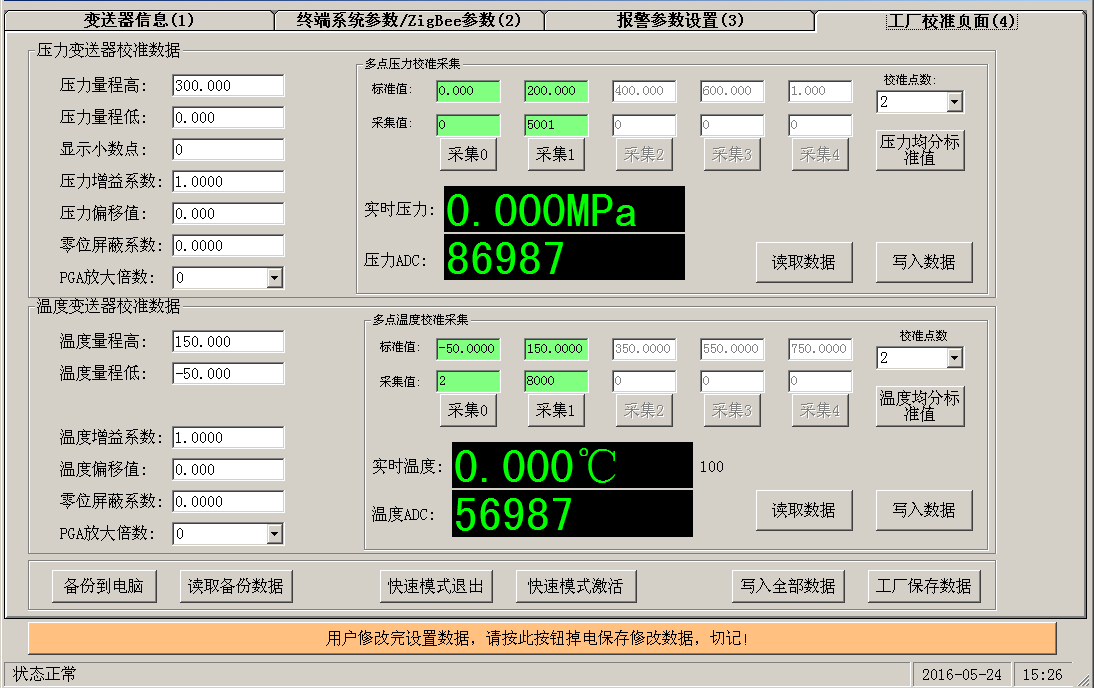 工廠校準頁面主要是溫度和壓力的校準數據,此為工廠數據。工廠數據參數意義以及設置詳細情況咨詢常州天利,這里不做太多解釋。需要特別說明的是本公司采用多點數據擬合算法,保證壓力和溫度傳感器的數據準確性。可以根據變送器的類型,選擇校準溫度還是壓力通道。工廠數據采集完畢需要寫入操作,然后需要執行工廠保存操作數據才會被保存在變送器內部。
